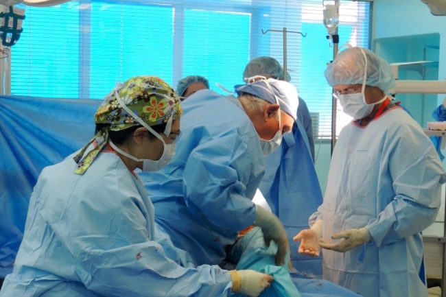 Drs Dorr and Gilbert in surgery with PA Lisa Yamaguchi