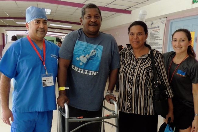 June 19, 2025 paullenk Patient Wiston Hodgson McNelson with his wife, his surgeon Dr. Cambize Shahrdar, and physical therapist Nicole Orlando during his first walk after knee replacement surgery